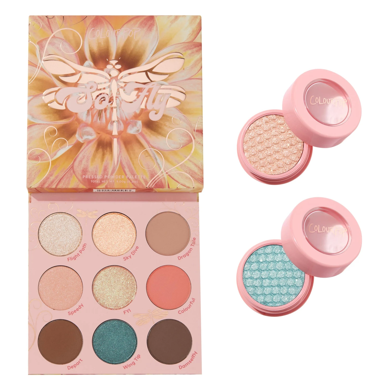 💗 So Fly Pressed Powder Palette – Stay so fly with this dragonfly-inspired palette featuring a mix of champagne, coral, mauve, chocolate and splash of teal in Matte, Matte Sparkle and Metallic finishes.Â